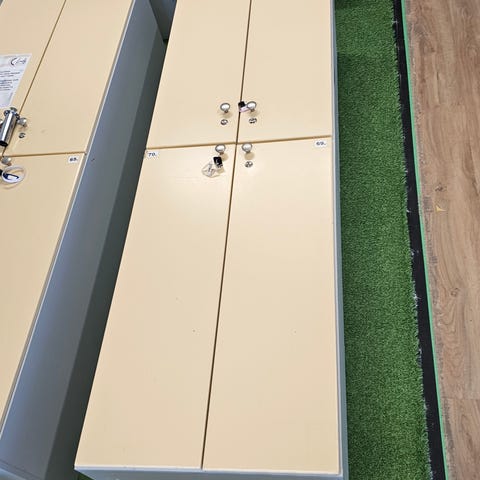Kaksi erillistä kaappia, toinen leveä kahdella ovella ja yksittäinen kaappi vasemmalle kääntyvällä ovella.