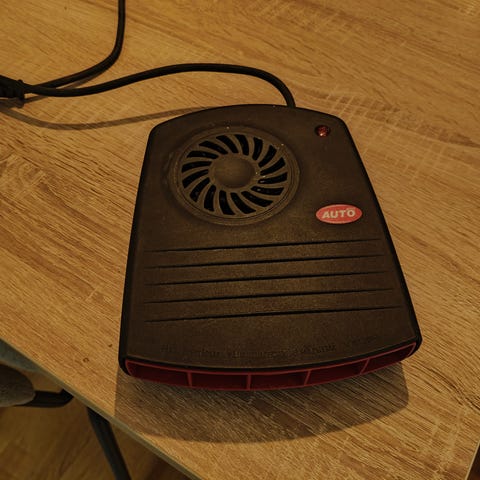 Auto sähkölämmitin musta, jossa tuuletin ja virtajohto. Lämmitin on suunniteltu käytettäväksi auton sisätiloissa. Laite on valmistettu kestävästä muovista.