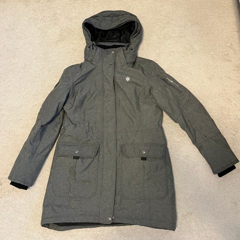 Kerran käytetty, ei tahroja. Soveltuu viileämmille säille ja tarjoaa suojaa tuulelta. Takin pituus ilman huppua 86cm.