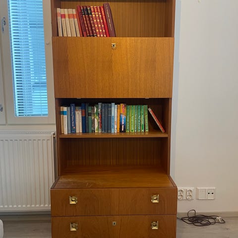 70-luvun 2-osainen kirjahylly. Kaapeissa pientä tahraa, mutta päällisinpuolin siisti.