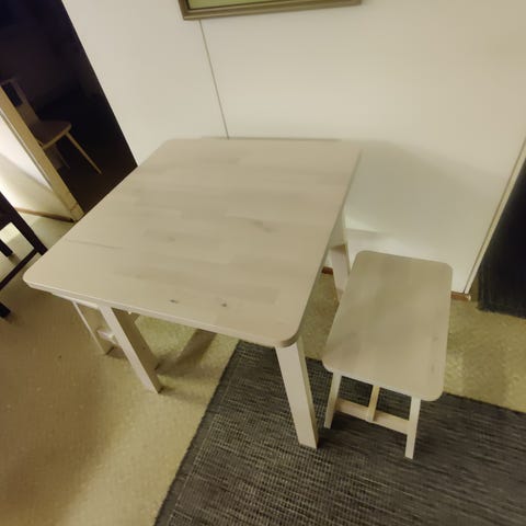 Pöytä ja kolme tuolia. Pöytä on valkoinen ja suorakulmainen. Tuolit ovat valkoiset ja valmistettu puusta. Hyväkuntoisia ja siistejä. Maksu käteisellä.
