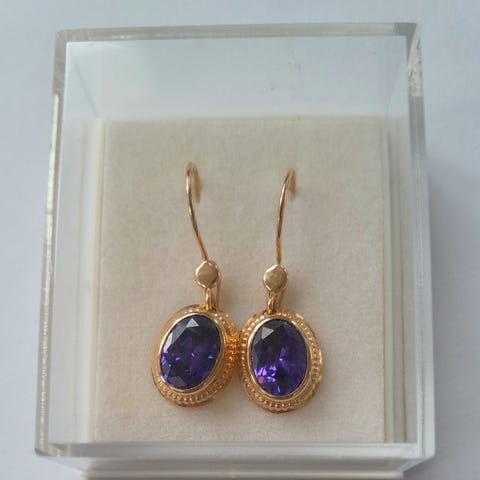 Näyttävät kultaiset vintage korvakorut. Kivenä todennäköisesti hematiitti. Korun korkeus noin 34 mm. Korun leveys noin 6 mm. Taustoissa/lukkoina silikonitaustat.