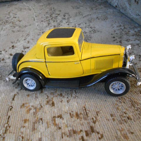 Ford malliauto, jossa on punainen ja hopea väritys sekä musta katto. Pieni koko, valmistettu muovista ja metallista. Malliauto on tarkoitettu keräilyyn tai leikkiin