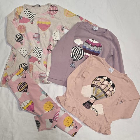 Vaatepaketti: 3 pitkähihaista paitaa ja kolmet housut koossa 98. Erittäin siistissä kunnossa, sillä ehtineet vaatepaljoudessa vain muutaman kerran päälle. Vihreät colleget olleet hieman enemmän päällä.