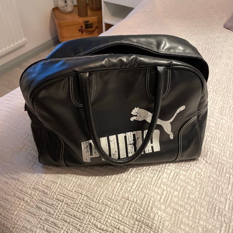 Puma tekonahkainen unisex-laukku, jossa musta ulkopinta ja vaaleanpunainen sisävuori. Laukussa on vetoketjutasku takana ja tilava sisätila, sopii monenlaiseen käyttöön. Paljon käytetty ja sisus nuhjuuntuneen värinen, koska puhdistus hankalaa meikeistä ym.