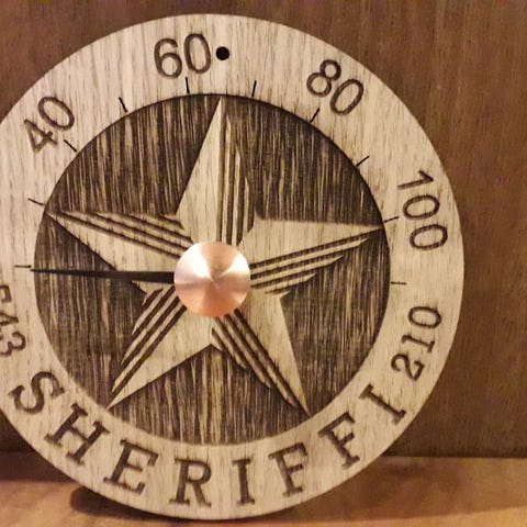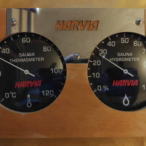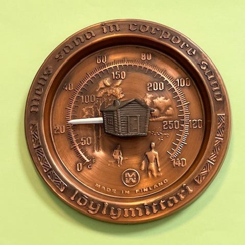 Mekaaninen lämpömittari, mittaa saunan lämpötilan asteikoilla Celsius ja Fahrenheit.