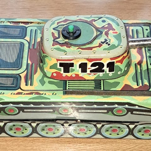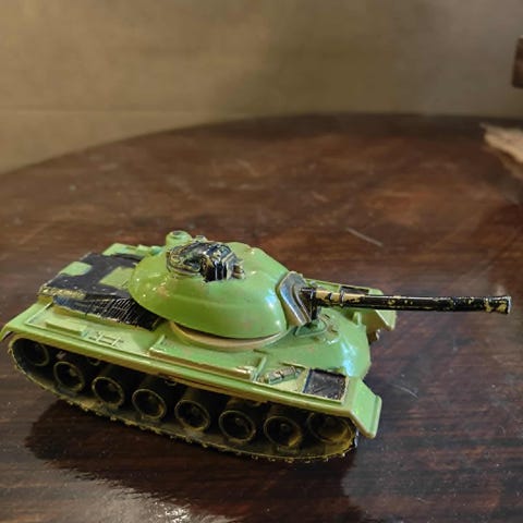 Panssarivaunu pienoismalli, jossa yksityiskohtainen rakenne ja pyörivä torni. Sopii keräilyyn tai sisustukseen.