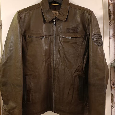 Camel active nahkatakki, väri ruskea, koko M tai L. Takissa ei koko merkintää, mutta luulen, että kokonon M. Takissa on useita taskuja ja sisävuori, joka näkyy kuvissa. Materiaalina on nahka, ja takki on suunniteltu miehille.