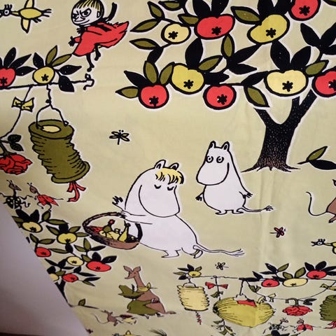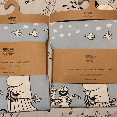 Myydään vihreäpohjainen lasten muumi pussikalana setti. "Hemulin imuri"