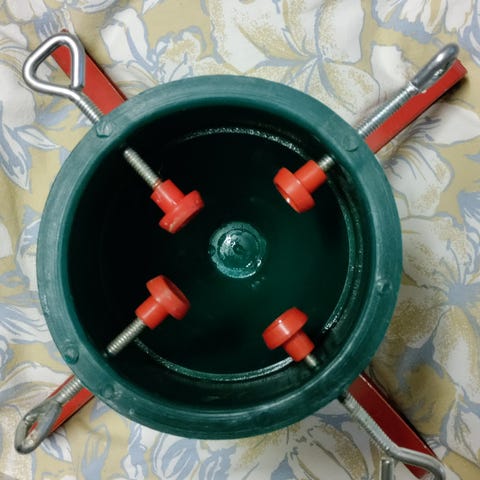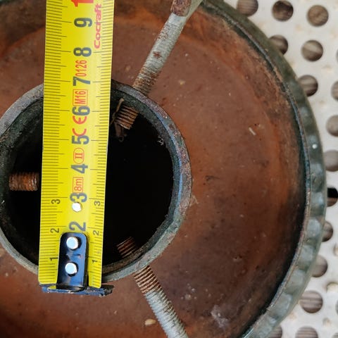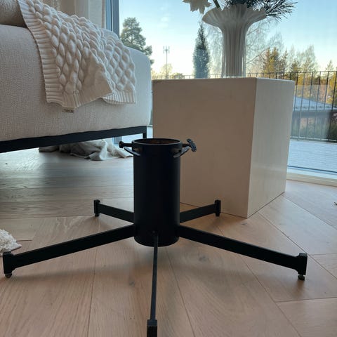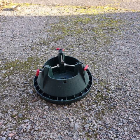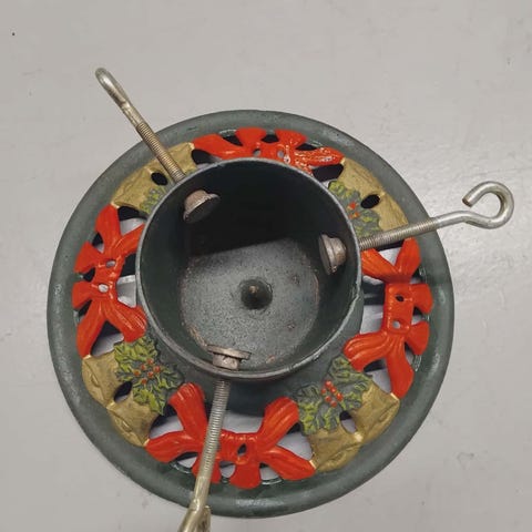 Vanha harmaaksi maalattu tuleva metallinen kuusenjalka. Sisällä vähän ruostetta.