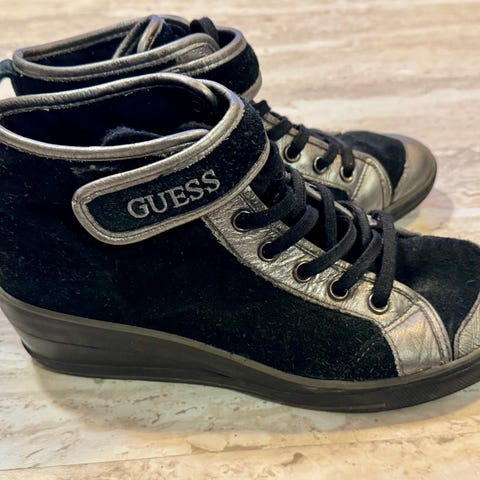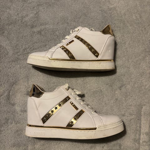 Hyväkuntoiset ja vähän käytetyt Guessin "kiilakorkoiset" tennarit. Korko ei näy ulospäin mutta sisäpuolelta kenkä on kuin korkokenkä.