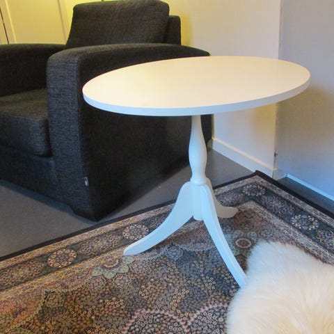 Ihana valkoiseksi maalattu pallojalkainen pikkupöytä. Kaverina myös valkoiseksi maalattu, säädettävä jakkara.Vain nouto.