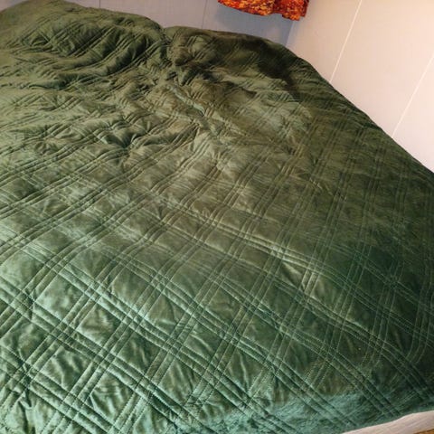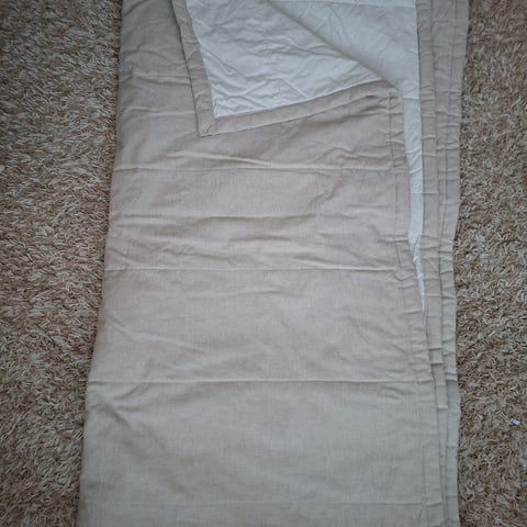 Univisio parisängyn ruskea päiväpeitto 240 x 245 cm, etupuolella valkoinen kohoneulos, alapuoli valkoinen. Pesty, ei eläintalous. Vain nouto.