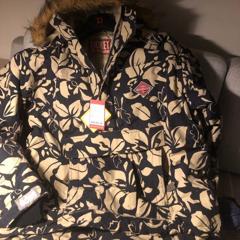 Kirjava Descente anorakki. Valmistettu Japanissa. Huppu piilossa kauluksessa. Takissa on jälkiä (ks. viimeinen kuva).