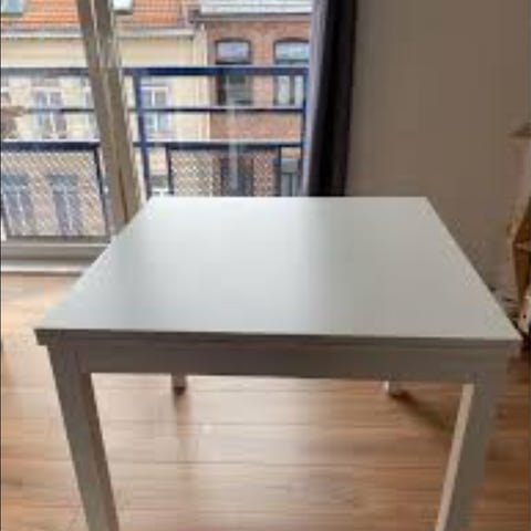 IKEA pöytä, jossa suorakulmainen valkoinen pöytälevy ja valkoiset metallijalat koristeellisilla yksityiskohdilla. Sopii esimerkiksi työpöydäksi, kirjoituspöydäksi tai pieneen ruokailutilaan. Pöytä on kevyt siirtää ja sen alle jää hyvin jalkatilaa.