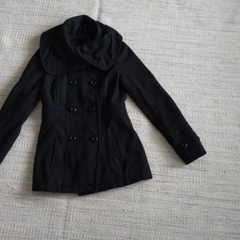 Hyväkuntoinen naisten harmaa villakangastakki hopeisilla napeilla. Oikein siisti ja sievä päällä. Koko XS.