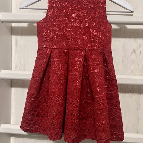 Lindex Holly Whyte lasten mekko, koko 110 cm, punainen väri. Mekko on valmistettu koristeellisesta kankaasta, jossa on kukkakuviollinen tekstuuri. Mekossa on takana vetoketju.