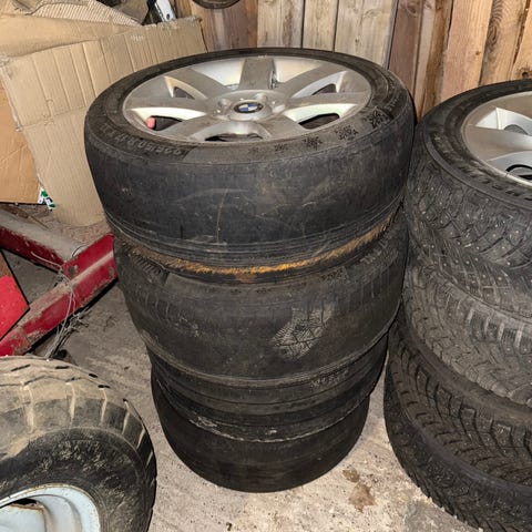Suorat ja ehjät bmw vanteet vanhoilla kitkarenkailla. Renkaissa pintaa 2 ja 6 millin välillä.