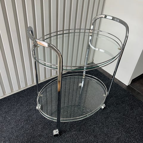 Myydään pyörillä oleva metallinen tarjoiluvaunu, jossa alataso on peililasia.