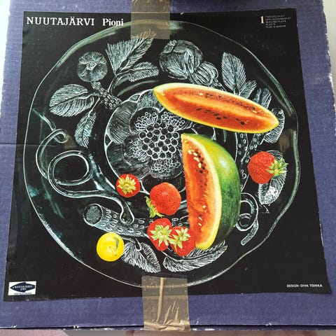 Nuutajärven upea lasilautanen. Halkaisija 33 cm. Oiva Toikan signeeraama.