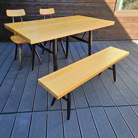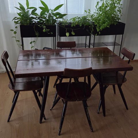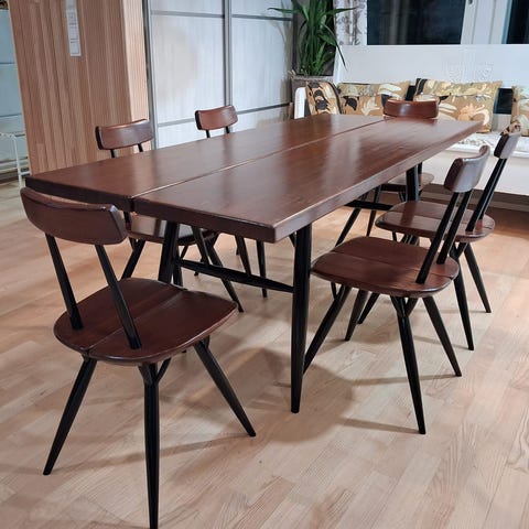 Neljän hengen ruokailuryhmä 60/70 -luvulta. Hyvässä ja siistissä kunnossa ikäänsä nähden. Pituus 120cm