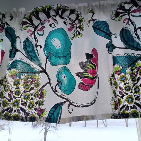 Vallilan hyväkuntoinen, käytetty, tehdasvalmisteinen verhokappa.Kuosi Silkkiruusu design Saara Kurkela. Koko 242 cm*58cm.