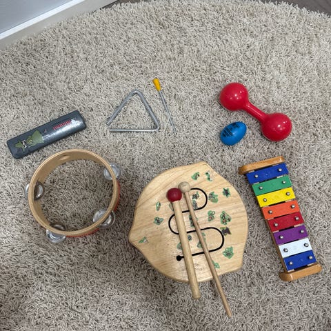 Lasten soittimet. Kolme marakassia ja yksi tamburiini. Kunto hyvä.