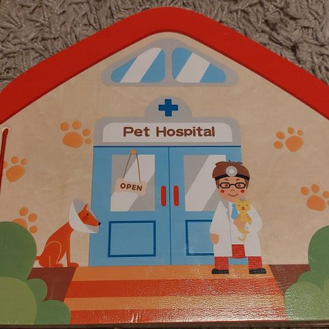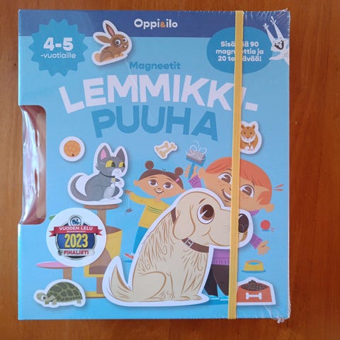 Siistikuntoinen magneettikirja lemmikeistä ja heidän tavaroistaan, mukana tehtäväkortteja.