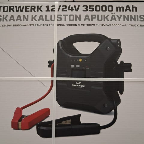 Motorwerk apukäynnistin, jossa 8000mAh kapasiteetti ja 1200 ampeerin käynnistysteho. Soveltuu 12V ja 24V ajoneuvoille. Varustettu 35000 mAh (35 Ah) litium-rautafosfaattiakulla. Sisältää automaattisen jännitteen tunnistuksen ja ylikuormitussuojan.