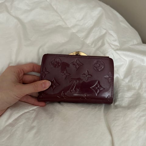 Louis Vuitton Vernis Elise -lompakko punaisena kiiltonahkassa, jossa on kohokuvioitu monogrammikuvio. nahkainen lompakko unisex-käyttöön, näkyviä kynänjälkiä, huomioitu hinnassa. Lompakossa on useita korttipaikkoja ja taskuja seteleille ja kolikoille. Väri punainen. Sopii päivittäiseen käyttöön. aito Louis Vuitton.