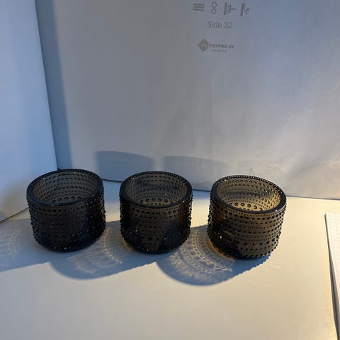 Kolme käyttämätöntä uutta kynttilälyhtyä.