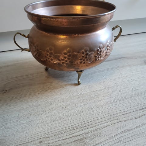 Kuparinen maljakko, painoksia 660g korkeus noin 9 cm, halkaisija noin 9 cm. Sopii koristekäyttöön tai kukkien asetteluun.