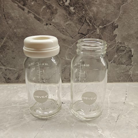 Kuusi kappaletta, kolme isompaa ja kolme pienempää lasista tuttipulloa, Vintage Jenatherm, jena glas, telineessä. Ehjät pullot ja muovinen teline.