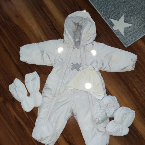 Äitiyspakkauksessa tullut Reiman toppahaalari. Ehtinyt meillä vain paristi päälle. Kunto uutta vastaava. Ainoana moitteena huomasin pienen kellastumaa toisessa vetoketjussa puvun yläosassa, ei juurikaan näy, kts. viimeinen kuva. Ei ole yritetty poistaa. Pukua ei ole pesty.