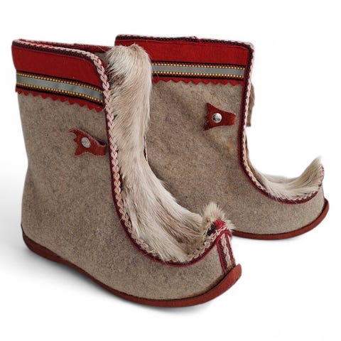 Huoparunko, aitoa poronkarvaa kärjessä ja sivuissa, punamustat nauhat ja perinteiset koristesaumat. Säilytetty kuivassa ja lämpimässä.