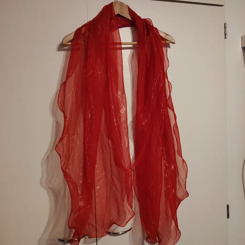 Reilun kokoinen läpikuultava juhlahuivi, 100 x 150 cm. Turkoosinsininen, hopeakuviointi, 100% polyesteri. Nätti huivi vaikka pikkujouluun. Nouto, postitus tai ToriDiili.