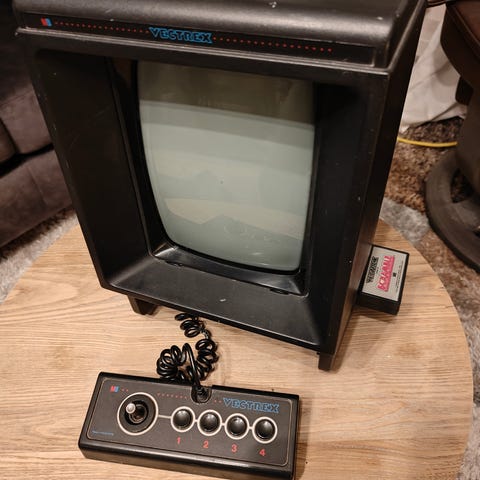 Micro Arcade Machine Mini arcade-pelikone, jossa on pieni näyttö ja ohjaimet. Pelikoneessa on joystick ja painikkeet A ja B, äänenvoimakkuuden säätö sekä reset-painike. Laitteen koko on pieni, ja se on suunniteltu pöytäkoneeksi tai keräilyesineeksi.
