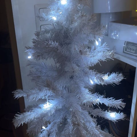 Hyväkuntoinen pinkki joulukuusi -koriste metallijalalla. Korkeus 32 cm.