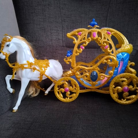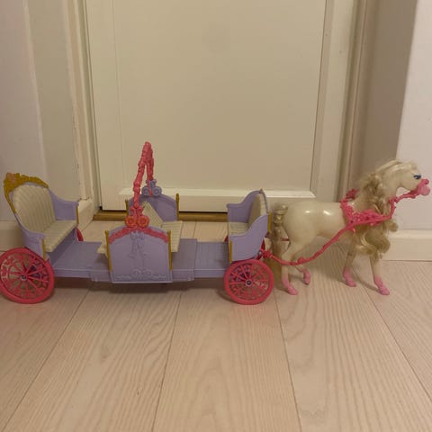 Barbienukelle sopiva lelu, joka sisältää vaunun ja hevosen. Vaunu on valkoinen koristeellisilla yksityiskohdilla ja pyörillä. Sininen hevonen mukaaan. Noin 12 vuotta vanhat, täysin ehjät.