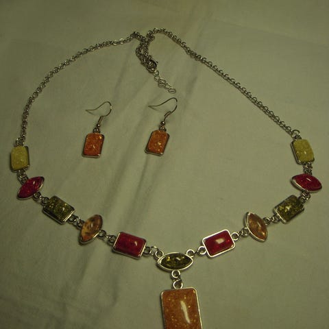 Kaulakoru ja Korvakorut helmikukkia hopeanväriset ja kirkkaita kiviä ketjussa ja helmien ympärillä kaulaketjun pituus 52 cm papukaijalukko helmikukan halkaisija 13 mm korvakorut nasta malli pituus 30 mm käyttämättömät korupussi tulee mukaan sopii kauniisti juhlapukuun tai morsiuspukuun kulkeutuu sovittaessa lähialueelle + postitus yht 28 €
