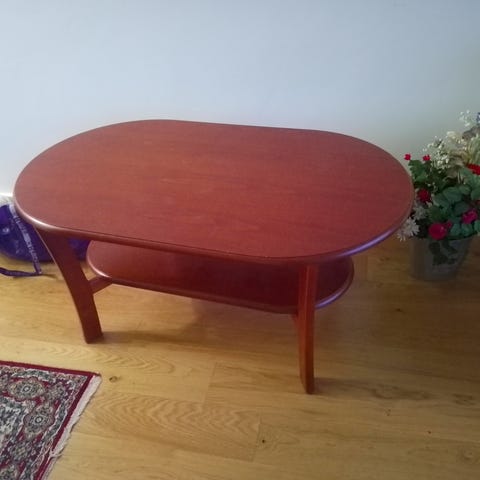 Myydään punaruskea sohvapöytä. Yleisilme siisti.