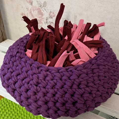 Uudet virkatut aktivointi-/nuuskukorit. Beige (halkaisija n.25cm, korkeus n.7cm), vaaleankeltainen (n.21cm, n.7cm) ja tummanharmaa (n.20cm, n.9cm). Linda trikookuteesta virkatut, pienemmissä hapsuina myös keltaista fleecekangasta, materiaalit uusia. Suositellaan käsinpesua ja kuivausta ilmavasti.