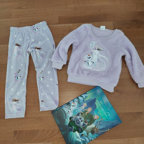 Pakettina Frozen-vaatteet. Housut ja yöpuku (paita erikseen toisessa kuvassa) noin kokoa 98/104, t-paita ja mekko noin 110. Paljon käytetyt, joten edullisesti. Hajusteeton pesu.