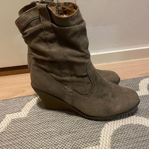 Nahkaiset nilkkurit kokoa 40. Lämpimän oloinen vuori. Nauhakiristys piilossa. Oikean kengän kannassa ulkopinnassa hieman notkahdusta kengän ryhdissä.