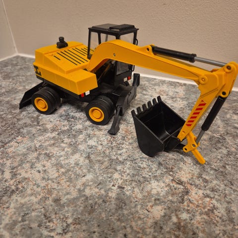 Emek kaivinkone. Ollut leikeissä, mutta päällisin puolin ehjä, mutta kauha ei pysy enää ylhäällä.