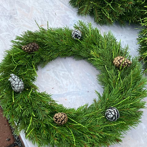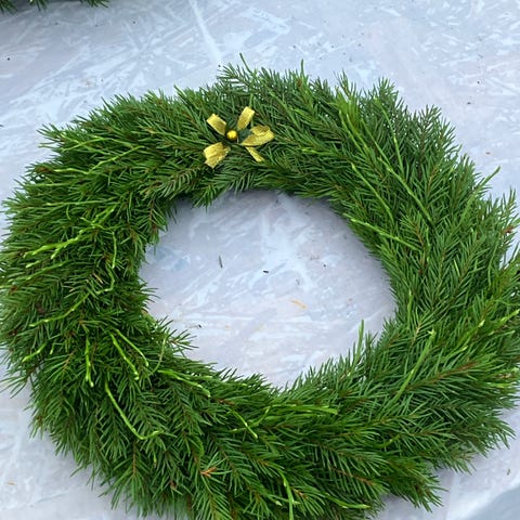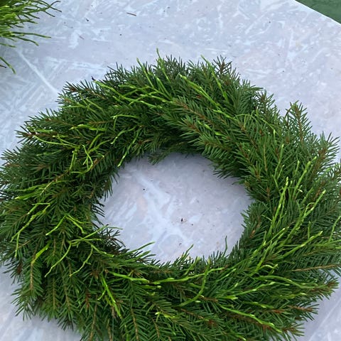 Havukranssi aidoista havuista ripustuslenkillä ja koristeilla.