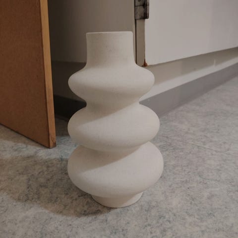 IKEA RÄFFELBJÖRK -maljakko, keskikokoinen. Helmiäisvärinen maljakko, joka on tehty paksusta lasista.