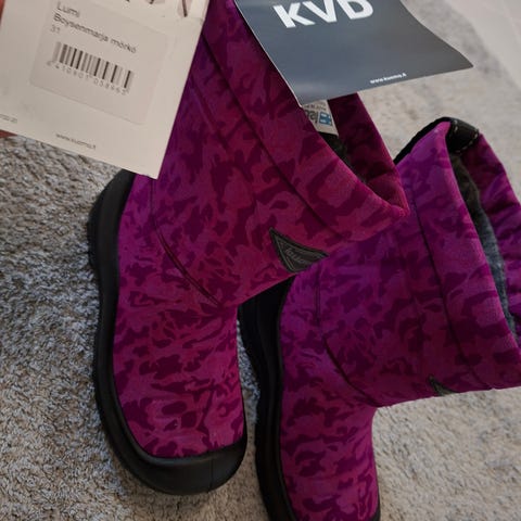 Vivon Lumi talvikengät koko 31. Valmistajan mukaan sisämitta 19,6cm. Ei enää uudenveroisessa kunnossa, katso kuvat. Molemmissa kengissä pieni viilto kankaassa ja vasemman kengän kärjen tuntumassa pieni jälki pinnassa, ei ole läpi, vain pintaosuma tullut jostakin. Kissatalous. Voi noutaa Lohjalta tai kulkeutuu Espoon keskukseen muutamana päivänä viikossa, josta voi noutaa virka-aikana. Postitus kuluja vastaan onnistuu.