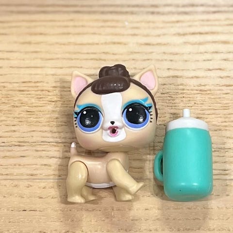 L.O.L. Surprise lasten lelu, joka sisältää koiran, kaksi hiuspinniä, juomapullon, harjan, pupunkorvat sekä asusteet koiran päällä. Osa asusteista ovat hieman kuluneita, mutta itse hahmo on todella hyvässä kunnossa.