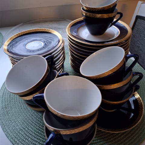 Kobolttinen tee-/kahvikolmikko. Arviolta 1980–1990-luvulta.